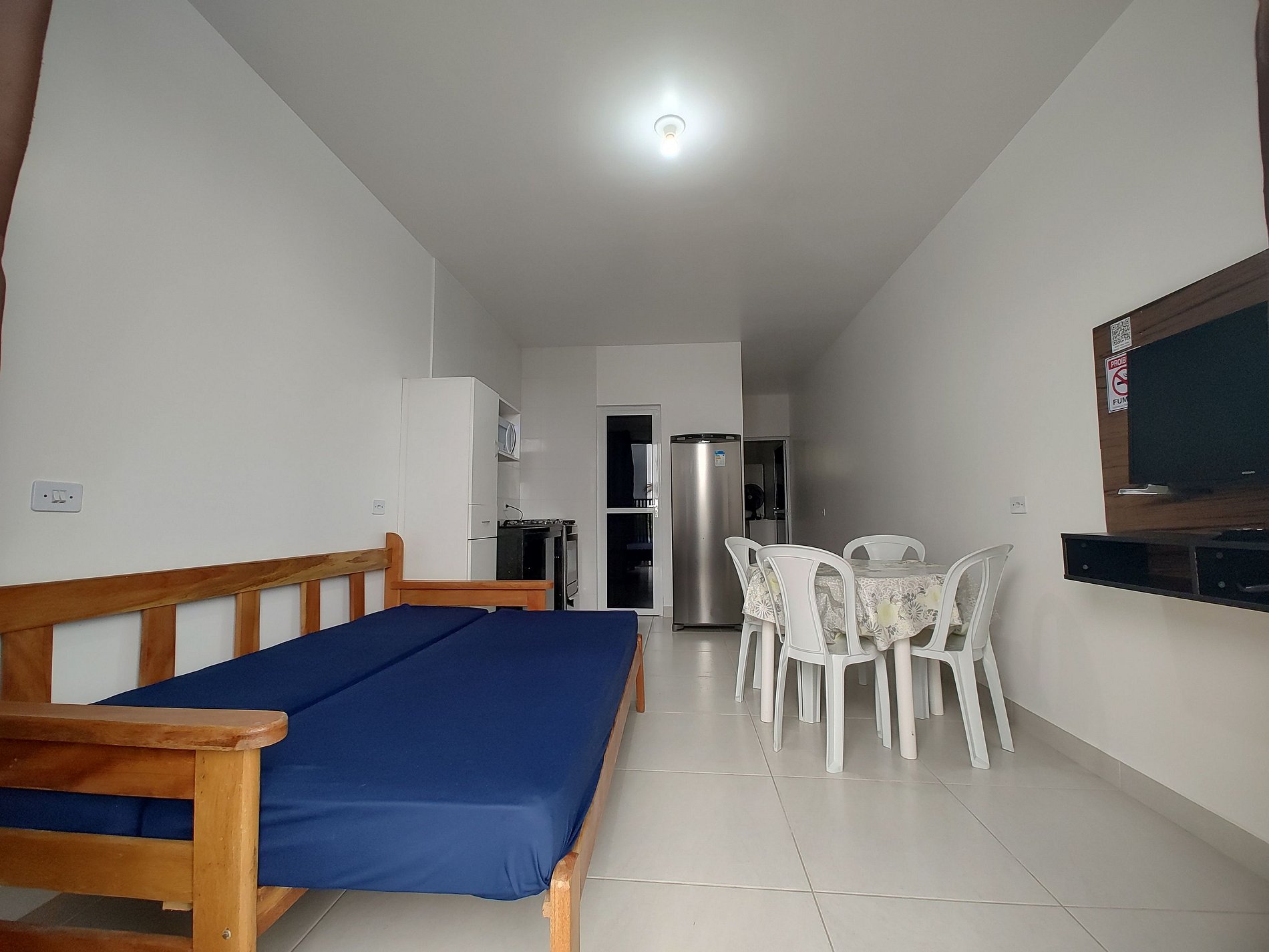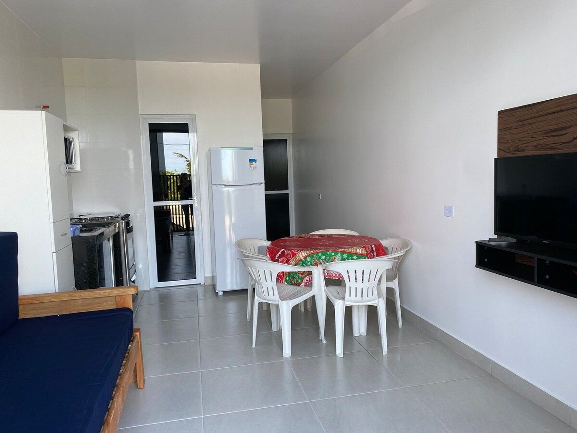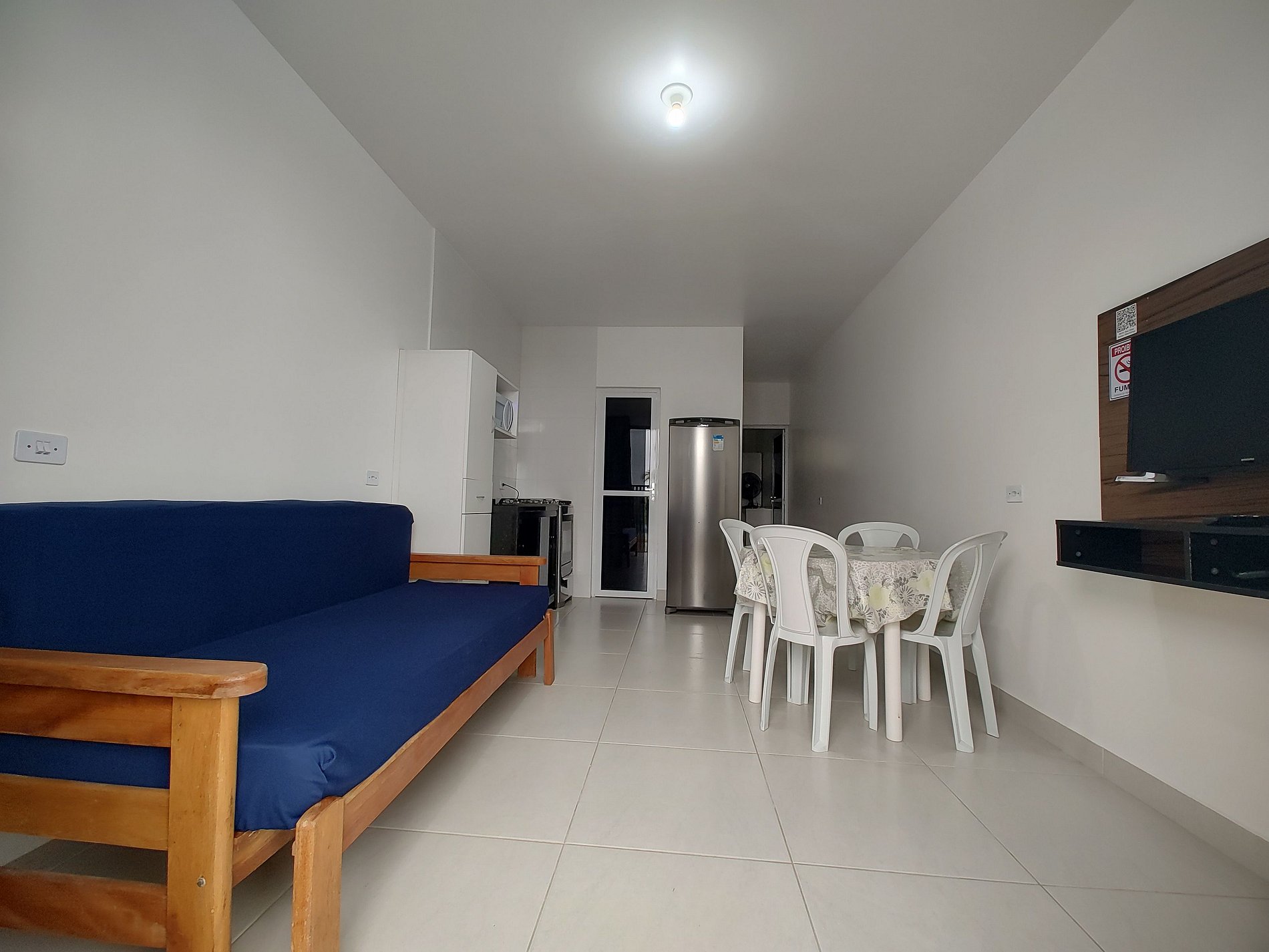 Apartamento amplo com 1 dormitório, sala/copa/cozinha, banheiro, área de serviço e estacionamento para um veiculo de passeio, wifi, ar condicionado, acomodação para 3 adultos e uma criança de até 12,0 anos, cama de casal, cama de solteiro e sofa cama, smartv 32", microondas, fogão 4 bocas, geladeira, utensílios de cozinha, apartamento frente ao mar na região central do balneário Ipanema