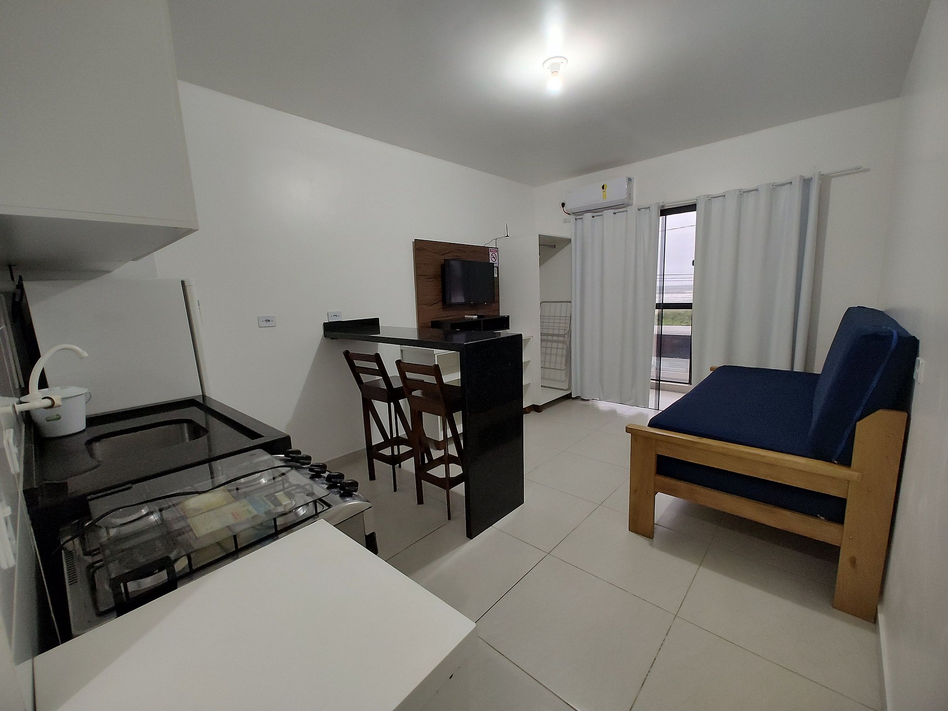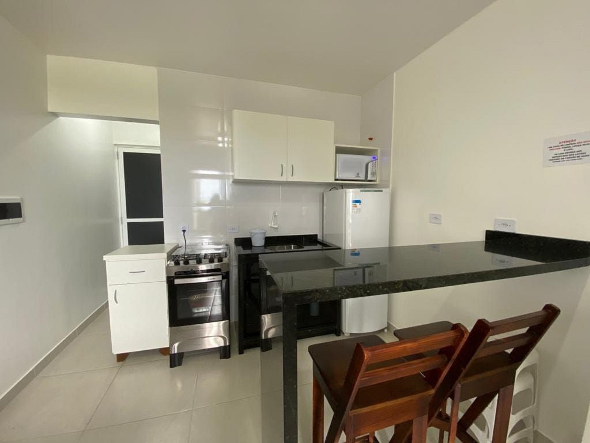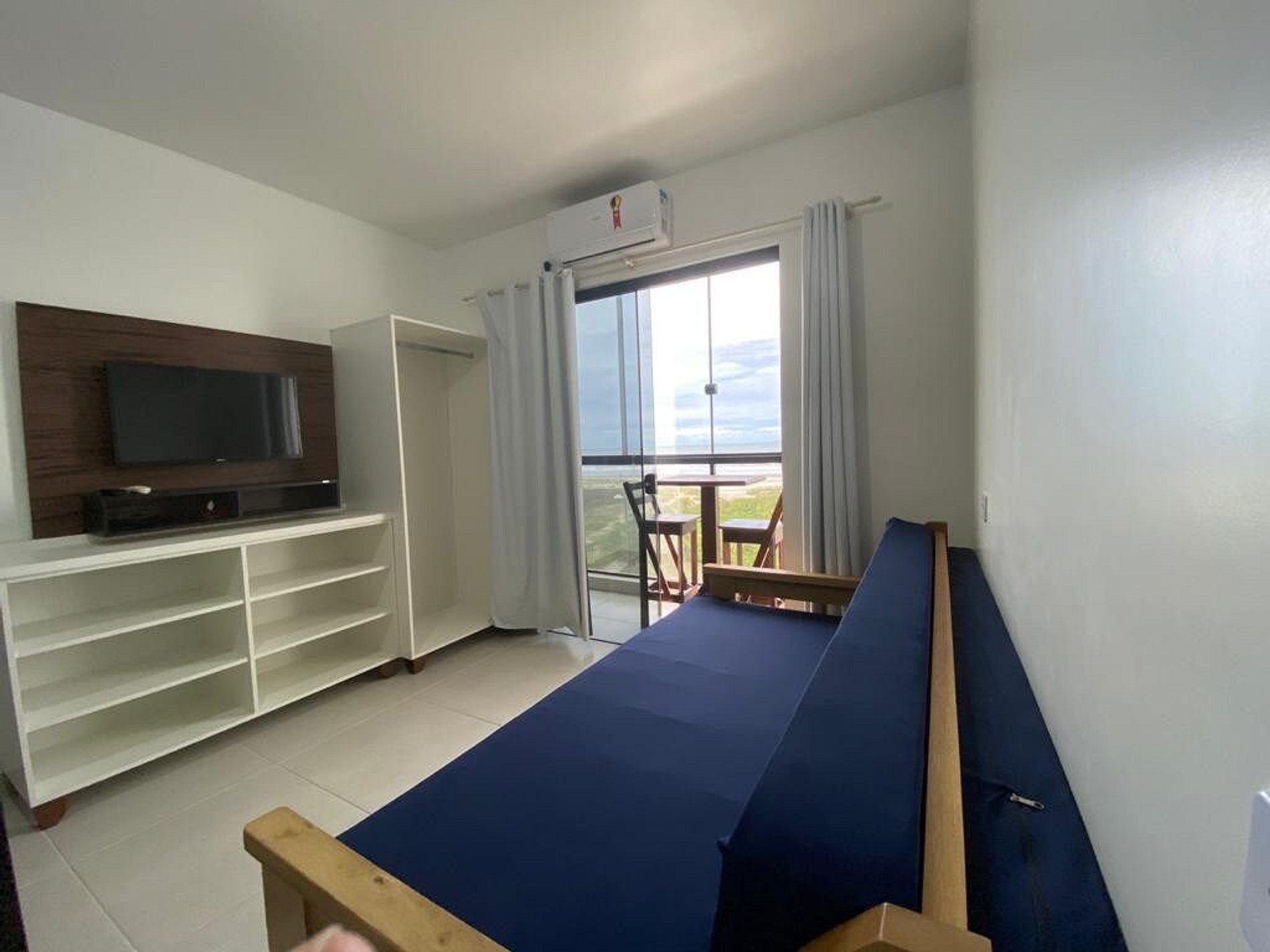 Apartamento conta com utensílios básicos de cozinha, ar condicionado, Smat Tv "32", geladeira, microondas, internet wi-fi, mesinha na sacada com linda vista mar.