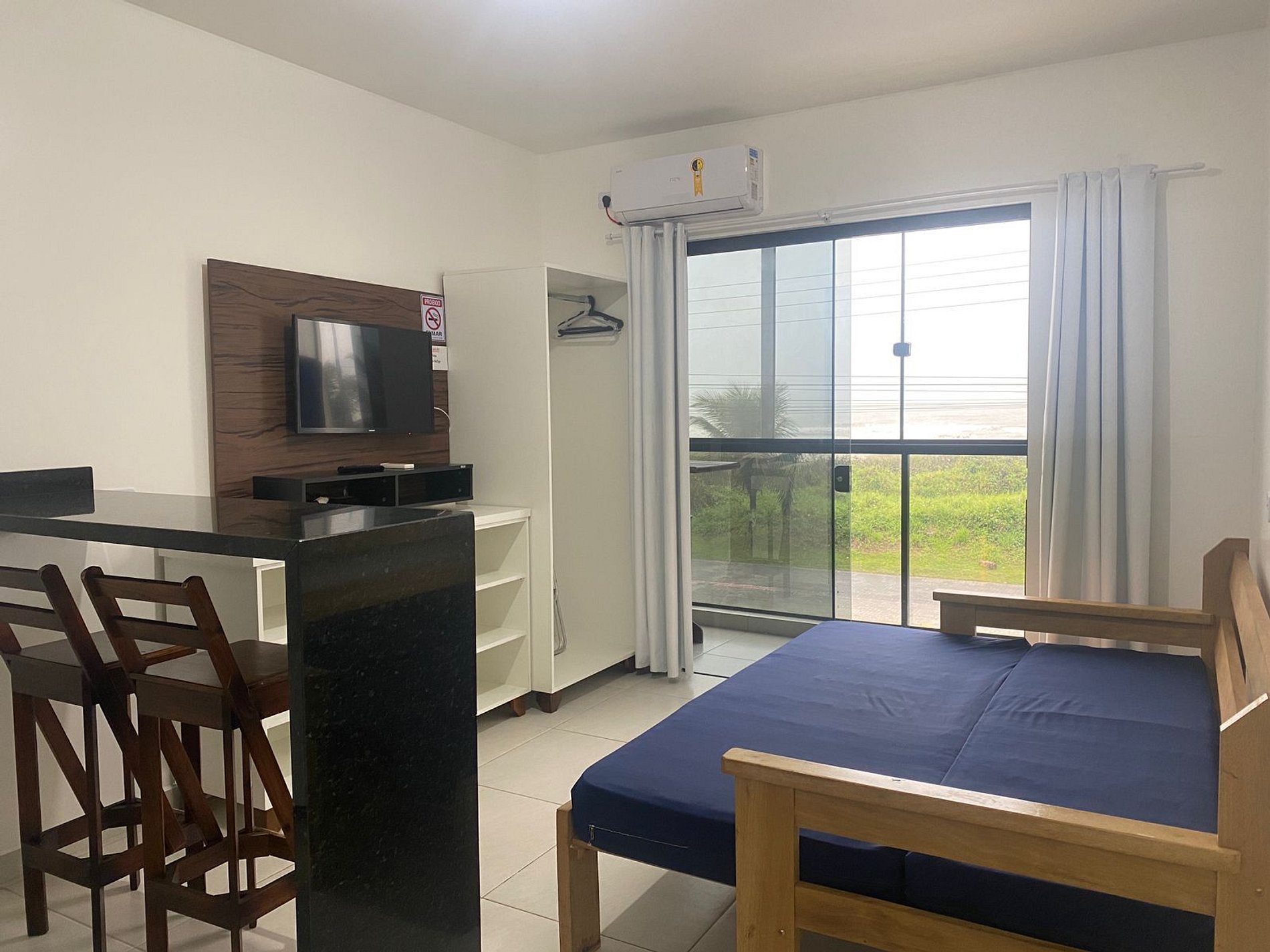 Estúdio beira mar, 1º andar, contendo: dormitório/cozinha, c/ sacada frente mar, bwc social c/ blindex, granito. Ar condicionado, microondas, Tv 32", mobília nova. Lavanderia e ducha fria coletiva. Acomodação máxima para 2,0 (duas) pessoas. Aluga somente para família. Estacionamento para 01 carro pequeno.
