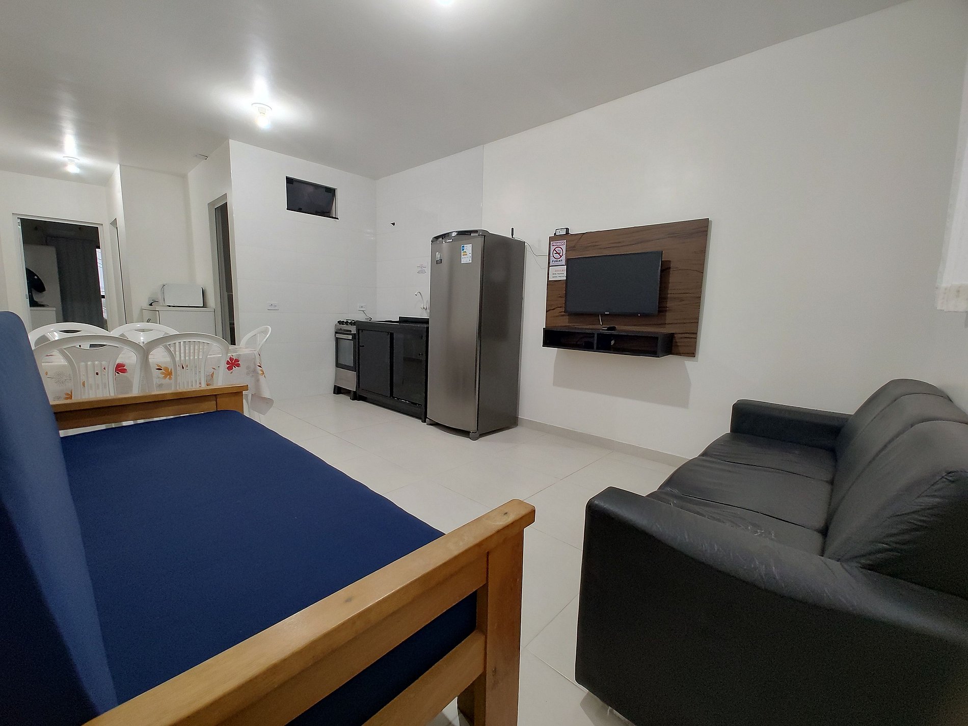 Apartamento conta com utensílios básicos de cozinha, ar condicionado no quarto, Smat Tv "32" na sala, geladeira, microondas, internet wi-fi.