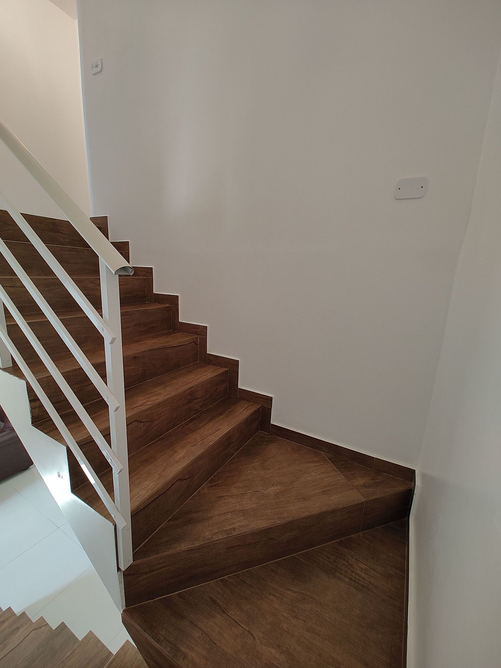 Rua Pavimentada, escadaria com corrimão, quintal, muro e portão alto.